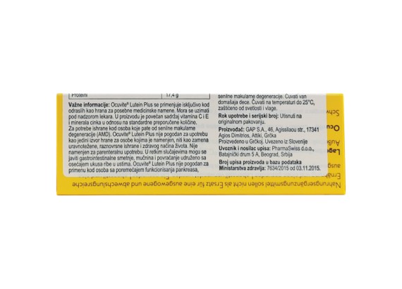 Dijetetski proizvod, hrana za posebne medicinske namene sa luteinom, zeaksantinom, omega-3 masnim kiselinama, vitaminima i mineralima. Sastav je prilagođen medicinski propisanim zahtevima ishrane osoba koje pate od senilne makularne degeneracije. ...