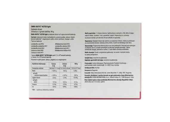 Omni-Biotic HETOX Light ima pozitivan efekat na zdravlje jetre i metabolizam. Sadrži 9 bakterijskih sojeva sa specifičnim svojstvima koja pomažu u smanjenju obima struka i viscelarnih masti (masti koje se nalaze oko organa u trbušnoj šupljini). Blagotvorno utiče i na nivo še ...