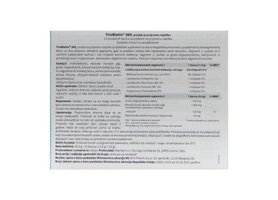 TrioBiotix 360 je dodatak ishrani na bazi probiotika i prebiotika, sa dodatkom hijaluronske kiseline i Litotamniona (mineralizovanog ekstrakta morske alge). Zajedničkim delovanjem podržava ravnotežu bakterijske mikroflore creva. Dodatak hijaluronske kiseline i ekstrakta morske alge koja je izvor ...
